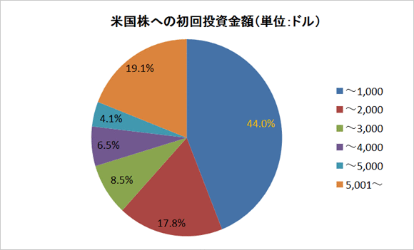 こちらのグラフを見ていただくとわかる通り、なんと、約半分のお客様が1,000ドル以下の投資金額で初めての米国株投資を行っています。米国株投資といえども、初めて投資するお客様は何十万、何百万円といった金額ではなく、約12万円以下で投資するお客様が半分もいらっしゃるのです。