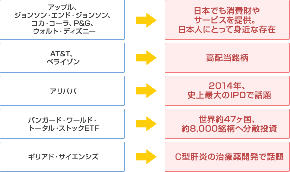 初めて米国株投資を行ったお客様は、アップルやジョンソン・エンド・ジョンソンなど私たちの生活の中でその製品・サービスが提供されている身近な企業やAT&T、ベライゾンのようなビジネス基盤が堅い高配当の企業を選択していることがよくわかります。その他、個別銘柄を選択する必要がなく、世界約47ヶ国に投資するバンガード・ワールド・トータル・ストックETFや、2014年9月に過去最大規模のIPOとして話題となったアリババ、C型肝炎の治療薬を開発して株価が高騰したギリアド・サイエンシズなども米国株投資初心者のお客様に支持されています。