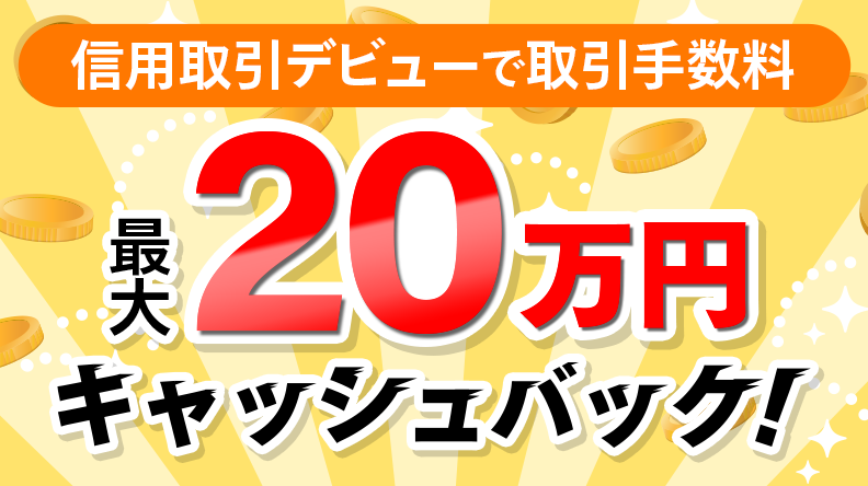 本キャンペーンにエントリーの上、エントリー月内に初めて日本株信用取引を行うと、初回取引から翌月末までに約定した信用取引手数料(税抜)をキャッシュバックいたします(上限20万円)。