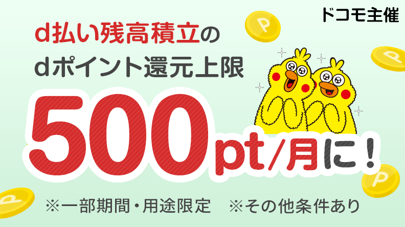 「d払い」内の「かんたん資産運用」メニューからお申し込みできるd払い残高積立の還元ポイントの月次付与上限が250ptから500ptにアップするキャンペーンです。