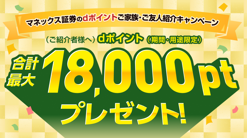 被ご紹介者様が新規口座開設およびNISA口座開設を完了すると、ご紹介者様に最大5,000pt、合計で最大18,000ptのdポイントをプレゼントいたします。本キャンペーンはマネックス証券の口座をお持ちでなくてもご参加いただけます。