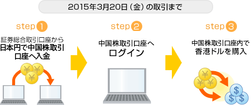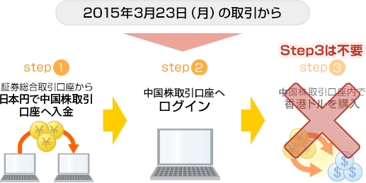 中国株取引口座内で香港ドルを購入する必要はなくなり、Step1で振り替えていただいた円から買付けが可能となります。 もちろん、これまで通り、香港ドルを購入してから買付けいただくことも可能ですので、お客様の投資スタイルに合わせて、2つの方法を選択いただけるようになります。