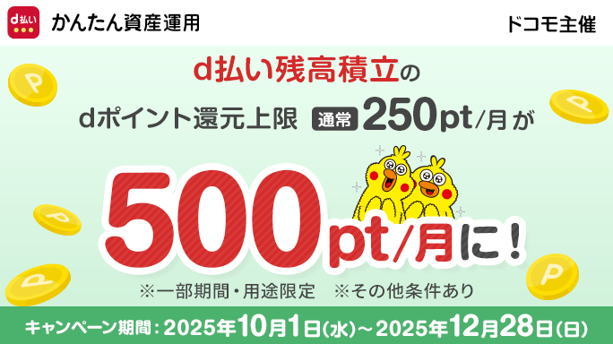 かんたん資産運用メニューからお申込みできるd払いの残高積立の月次付与ポイント上限が250pt→500ptにアップするキャンペーンをNTTドコモの主催で開催中!