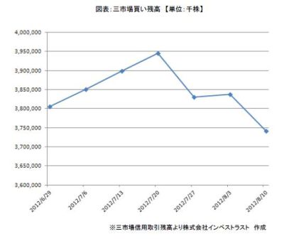 2012年8月16日付け日本経済新聞によると8月10日申し込み時点での信用取引の評価損益率は、3日時点の-19.69%から-18.15%にマイナス幅が縮小し、損益率の改善は6週間ぶりのことだと伝えています。