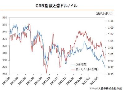 そして、CRB指数(コモディティ商品指数)のチャートを御覧ください。ギリシャのユーロ離脱を巡る問題から欧州リスクが再燃、外部環境の悪化からGWを挟んで株価も上値重くなってきましたが、どの市場よりも早く調整色を強めていたのが商品市場です。3月には下落を開始していました。流動性の低い市場から先に資金は逃げ出します。商品市場は為替や証券市場と比較すると小さなマーケットなので値動きが早い。2011年もQE2が終了する前の5月にCRB指数は下落を開始しており、2ヶ月程遅れて株価も大きな調整局面を迎えています。この指数が弱いということは世界の景気が好調だとは決して言えないのです。CRB指数のチャートと豪ドル/ドルのチャート、形が似ていませんか?!金や原油の値動きと豪ドルは相関性が高いので、豪ドル投資を考えるなら、こうしたコモディティ価格がこの先上昇に転じる可能性があるのか否かにも注目しなければなりません。