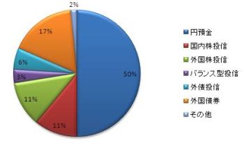 総資産の半分が円預金で、国内株投信11%、外株投信11%、バランス型投信3%、外債投信6%外国債券17%、その他2%です。