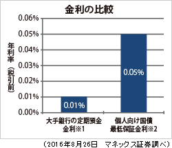 個人向け国債は基準金利をもとに、一定の計算で適用される金利が決まります(詳細は「個人向け国債の金利について」をご参照ください)。基準金利は2016年7月現在マイナスとなっていますが、個人向け国債は最低金利として0.05%(税引前)が保証されています。
