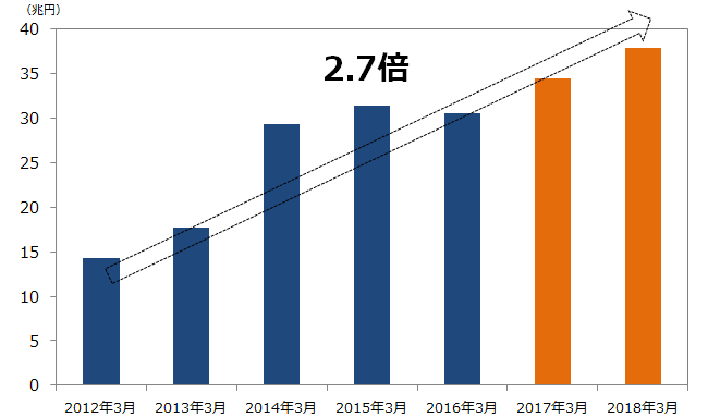 さらに来期(18年3月期)をみると、来期予想があるものだけの比較だが今期予想対比9.75%増益を見込んでいる。これを当てはめると、18年3月期の上場企業全銘柄の最終利益の合計は、37兆8500億円と、ボトムだった12年3月期の14兆3000億円に比べて2.65倍になる。6年間で利益が2.7倍になるとすれば、株価も6年間で2.7倍になって不思議はない。いや、むしろそうなるべきであろう。年率に直すと約18%の上昇率だ。