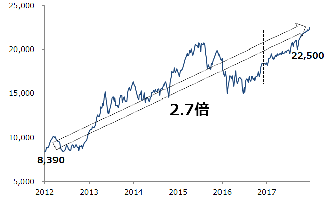今から1年後の2017年12月に日経平均は2万2500円に達すると予想する。強含む場面では2万3000円程度もあり得るだろう。2012年末からスタートした「アベノミクス相場」は2017年12月で5年が経過することになる。「アベノミクス相場」が始まる前の日経平均は8,000円台に低迷していた。日経平均の2012年の安値は週足では年初の8,390円が安値。そこを起点にすると、2017年12月に2万2500円とすれば、6年間で株価は2.7倍になる計算だ。
