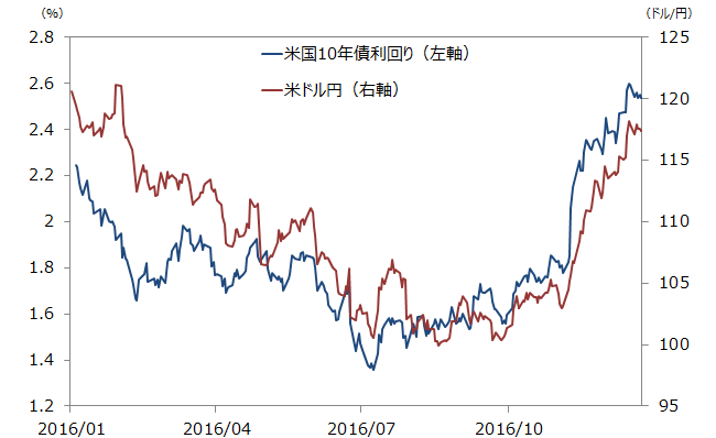 トランプ次期大統領は、大型減税やインフラ投資など財政拡張策を提唱している。これらが実行されれば米国の景気は刺激され、期待実質経済成長率と期待インフレ率が高まり、米国の長期金利は上昇する。教科書的な説明をするまでもない。財政政策の出動で景気が良くなって金利が上がるということだ。