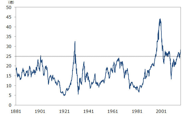 1800年代終わりから約150年もの間、CAPEが25倍を超えたのは4回しかない。1901年は1カ月だけ超えただけだが、その後株価は低迷、66年は25倍に届いていないけれどその後長期にわたって低迷した。象徴的なのは大恐慌の暗黒の木曜日の大暴落があった1929年、ITバブル、そしてリーマンショック前。これら3回はいずれも25倍をおおきく越えて、その後暴落につながっている。そして今は28倍と再び危険水準を超えている。10年単位でみた企業業績の改善ペースを越えて株価が上がり過ぎていることを示している。いつ大きな調整が起きてもおかしくないということである。
