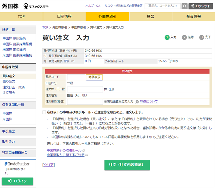 画面例(中国株 買い注文 入力)