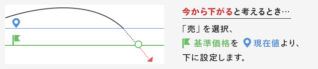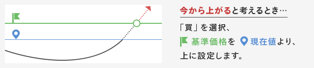一方で(2)は、現在値が100円で、98円まで下がってから反転して99円に上がったら新規の買いポジションを建てるという仕掛けです。 現在よりも値段が下がるが、ある金額で反転してその後上がっていくだろうと考える場合に選びます。