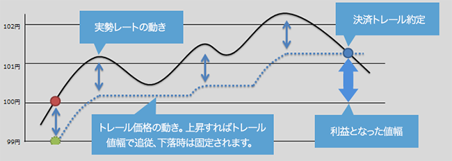 一番右側の段階ではトレールによってストップロス注文の水準が101.20円まで上がっていたため、値段が101.20円に下がったタイミングで決済注文が約定します。