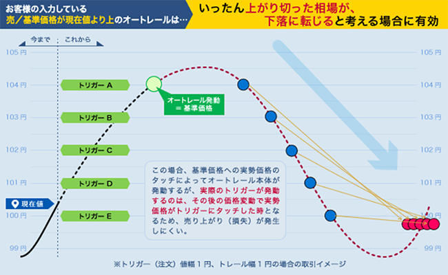 上の図では現在値が100.30円、104円まで上がったら売りたい(=基準価格)という逆張り的発想の順張りの売りをセットします。基準価格を104円とセットすると104円を超え、再び104円に下がってきたところで最初の売り仕掛けです。