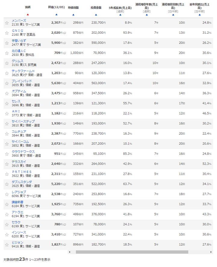 NISA非課税枠で投資したい中小型成長株を「マネックス銘柄スカウター」の10年スクリーニング機能を使って抽出しました。具体的なスクリーニング条件および抽出された銘柄は以下のとおりです。今年の非課税枠が残っている方は、ご自身の残りの非課税枠に応じて投資金額を調整してスクリーニングしてください。