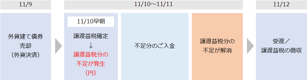 - 4営業日以内に予定されている譲渡益税徴収により、円貨預り金が不足する