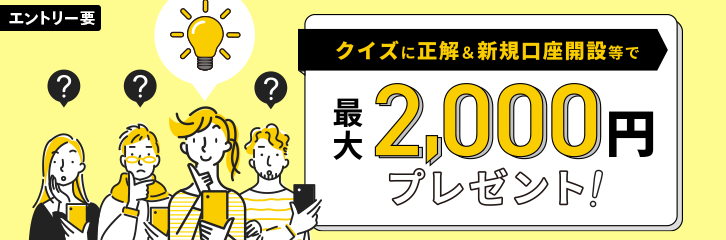 キャンペーン期間中にクイズに正解&証券総合取引口座を開設し、入金・取引まで完了された方に2,000円をプレゼントいたします!このチャンスにマネックス証券で投資デビューしませんか?