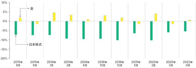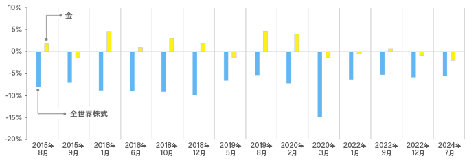 一般的に金融危機や地政学リスク等が高まるリスク回避局面においては、資金の逃避先として金が買われる傾向があると言われています。過去の金と各株式指数のデータを比較すると、株式の下落局面において、金の下落幅は比較的抑えられています。