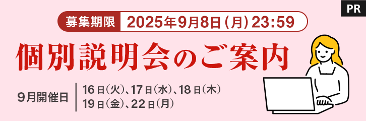 - 個別説明会には定員がございますので、お早めにお申し込みください。また、応募多数の場合にはご希望の日程での開催ができない可能性もございますので予めご了承ください。募集締切後、3~4営業日を目安に確定した日時をメールアドレス宛にご連絡いたします。