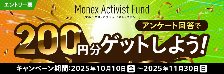 キャンペーン内容 | キャンペーン期間中、アンケートにご回答いただいた対象の方全員にマネックスグループ発の投資信託「マネックス・アクティビスト・ファンド(愛称:日本の未来、通称 MAF〈まふ〉)」の買付代金(200円)をプレゼントいたします。 |