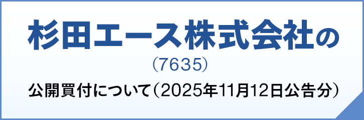 2025年11月12日(水)に、杉田エース株式会社(7635)の公開買付が発表されましたのでお知らせいたします。公開買付の開始日は、2025年11月13日(木)(当社での受付開始日時は2025年11月13日19:00)を予定しております。当社は公開買付復代理人となり、公開買付の申し込みをお受けいたしますので、応募されるお客様は所定のお手続きをお願いいたします。
