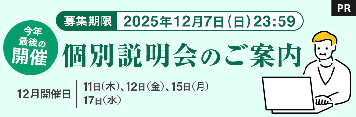 - 個別説明会には定員がございますので、お早めにお申し込みください。また、応募多数の場合にはご希望の日程での開催ができない可能性もございますので予めご了承ください。募集締切後、3~4営業日を目安に確定した日時をメールアドレス宛にご連絡いたします。