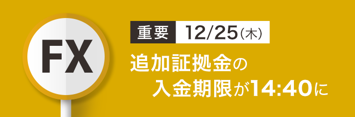 2025年12月25日(木)のFX PLUSの営業時間変更に伴い、追加証拠金判定後の強制決済の時刻が、14:40に変更になります。