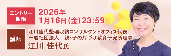 | セミナータイトル | 【PR】【期間限定配信】「物と思考の整理術」~実家と自宅の片付けの効果と手順~ |