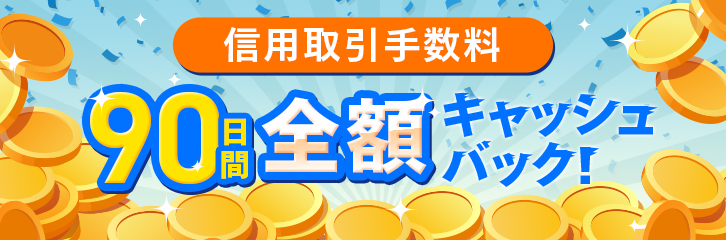 キャンペーン期間中に国内株式の信用取引口座(スタート信用含む)を開設すると、開設日から90日間に約定した信用取引手数料(税抜)を全額キャッシュバックいたします。