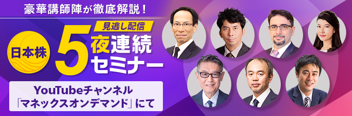 2026年1月26日(月)~30日(金)に開催した、豪華講師陣による「日本株5夜連続セミナー」をYouTubeで配信します。見逃した方・もう一度ご覧になりたい方はぜひ当社YouTubeチャンネル「マネックスオンデマンド」からご視聴ください。