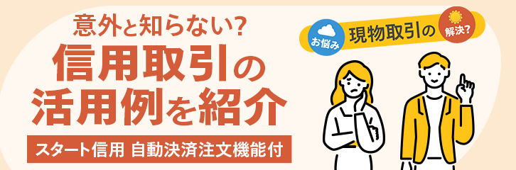 通常の信用取引では、株価の下落を見込んで売りから入る「空売り(売建て)」も可能ですが、スタート信用は「買建て(買い)」に特化しています。現物取引と同じ「安く買って、高く売る」という株価の値上がりが期待できる場面で、信用取引を活用することが可能です。