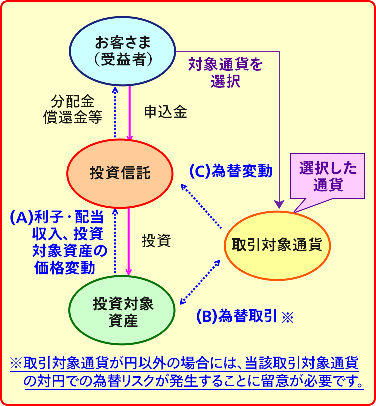 ■ 通貨選択型の投資信託は、株式や債券などといった投資対象資産に加えて、為替取引の対象となる円以外の通貨も選択することができるよう設計された投資信託です。