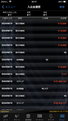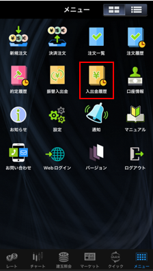 入出金履歴では、入金額、出金額、残高などをご確認いただけます。期間を指定して検索もできます。