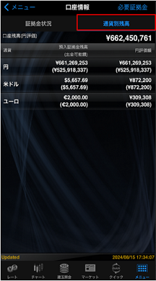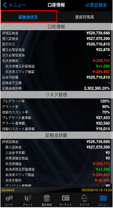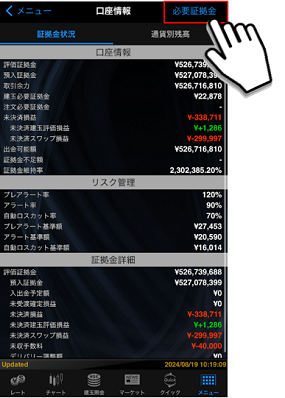 口座情報では、証拠金状況、通貨別残高、必要証拠金をご確認いただけます。証拠金関連用語についてはこちら